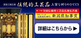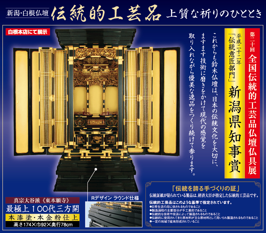 なお、明治の中頃には「白根仏壇同業者組合」を結成したとされております。昔の人の努力の積み重ねによって全国にその名声を高め、昭和50年「白根仏壇協同組合」を設立、昭和55年10月に「新潟白根仏壇」として、伝統的工芸品の指定を受けました。